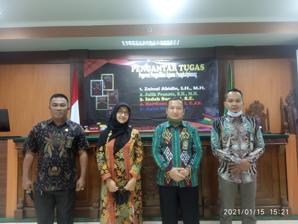 Jum’at, 15 Januari 2021, bertempat di ruang serbaguna, Pengadilan Agama Pangkalpinang mengadakan acara pengantar tugas lima orang pegawai Pengadilan Agama Pangkalpinang, Bapak Zainal Abidin, SH, MH, yang pindah tugas ke Pengadilan Agama Sugailiat, Bapak Julik Pranata, SH, MH, pindah tugas ke Pengadilan Agama Tanjung Pandan, Ibu Indah Suryani, SE, pindah tugas ke Pengadilan Agama Sungailiat, Bapak Hardiansah Ropi, S. Ak dan Bapak Agus Wijaya, SH, pindah tugas ke Pengadilan Agama Mentok.